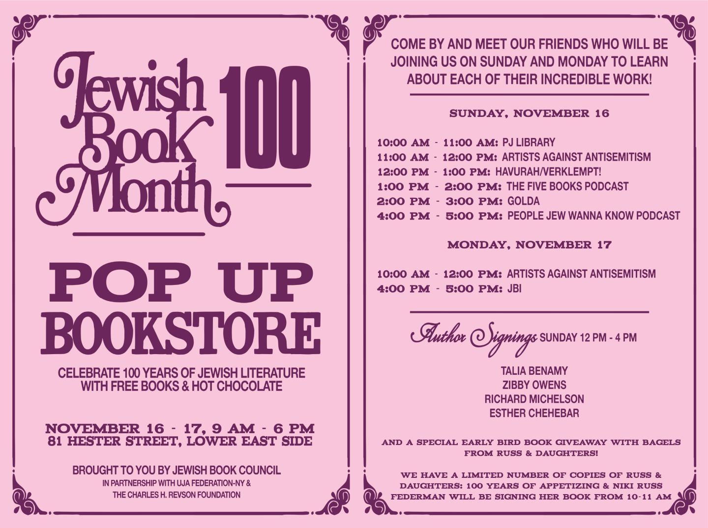 In honor of Jewish Book Month 100, Jewish Book Council—in partnership with UJA Federation-NY and the Charles H. Revson Foundation—is turning 81 Hester Street into a cozy Jewish bookstore. From November 16 – 17, Jewish Book Council is giving away 1,000 free Jewish books, hot chocolate, and Jewish literary goodies. Stop by to join in the celebration of Jewish Book Month!
