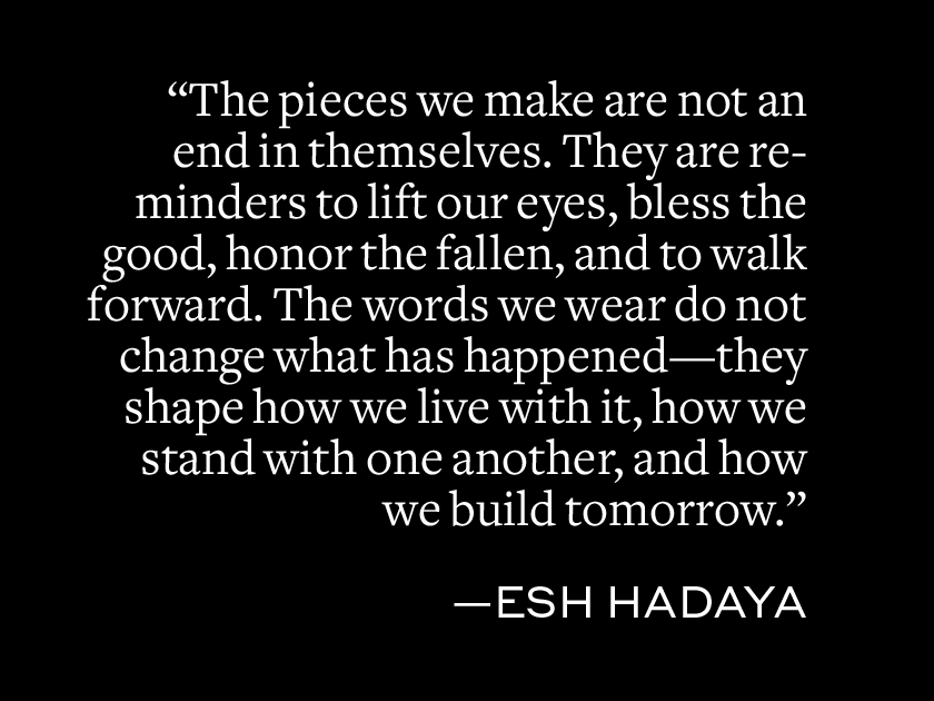 The pieces we make are not an end in themselves. They are reminders to lift our eyes, bless the good, honor the fallen, and to walk forward. The words we wear do not change what has happened – they shape how we live with it, how we stand with one another, and how we build tomorrow. So we keep engraving. We keep listening. Keep choosing life, with every letter.