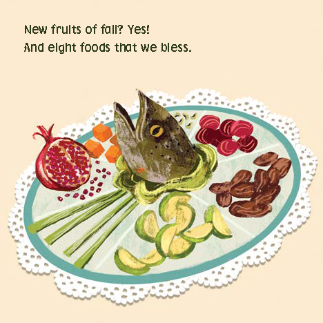 Blessing new foods for the fall is a Rosh Hashanah custom that many Jews across the globe practice. And in Anyada Buena, Shanah Tovah, an image of a seder plate is paired with my prose: “New fruits of fall? Yes! And eight foods that we bless.” While the prose doesn’t say the word “seder,” the symbol of the loaded plate is there to convey it.