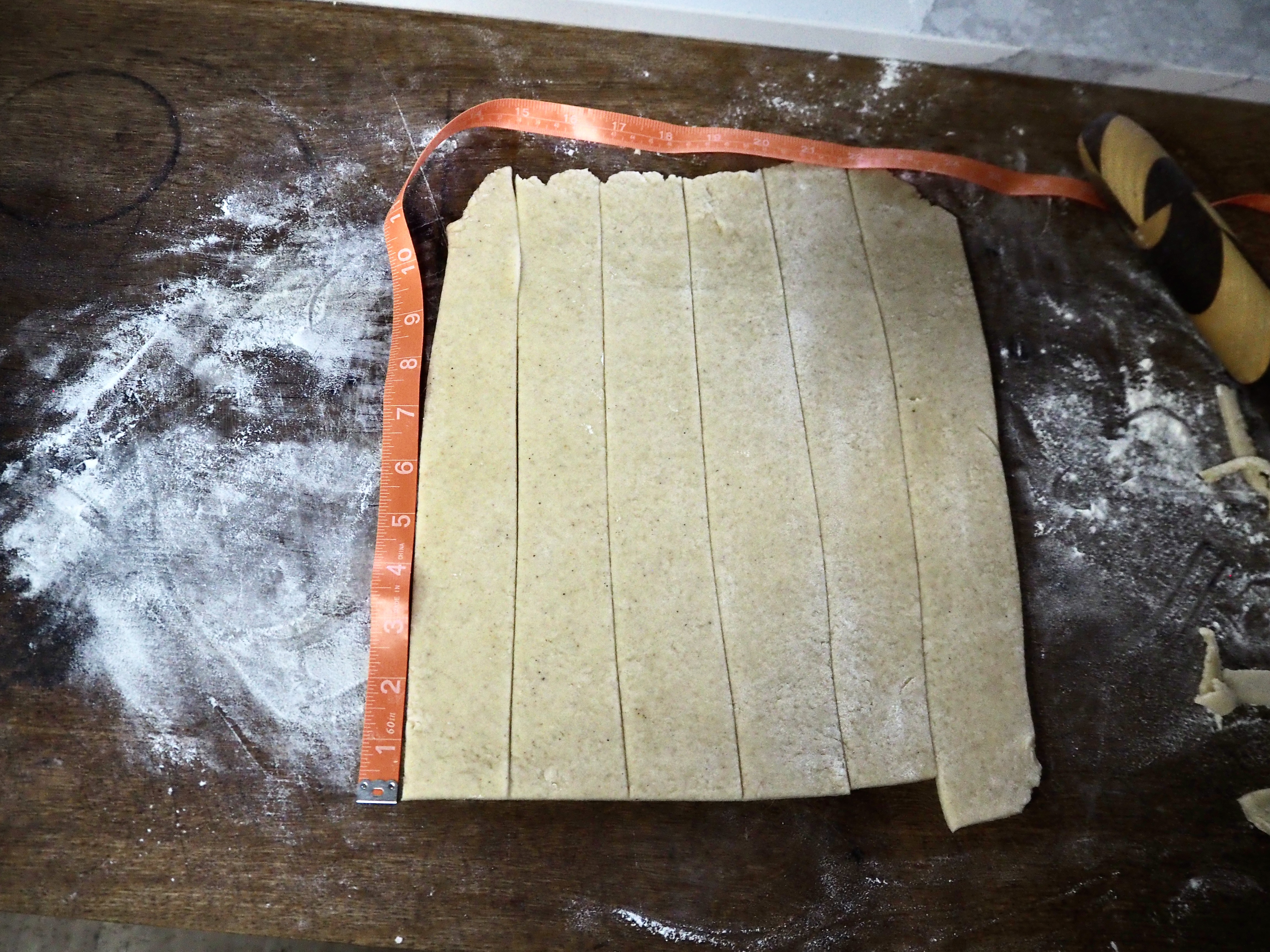 Generously flour a counter or board. Place one of the dough portions on the counter and roll it out to a rectangle about 1/8 inch thick. With a pizza wheel or sharp knife, cut the dough lengthwise into strips 1 1/2 to 2 inches wide.