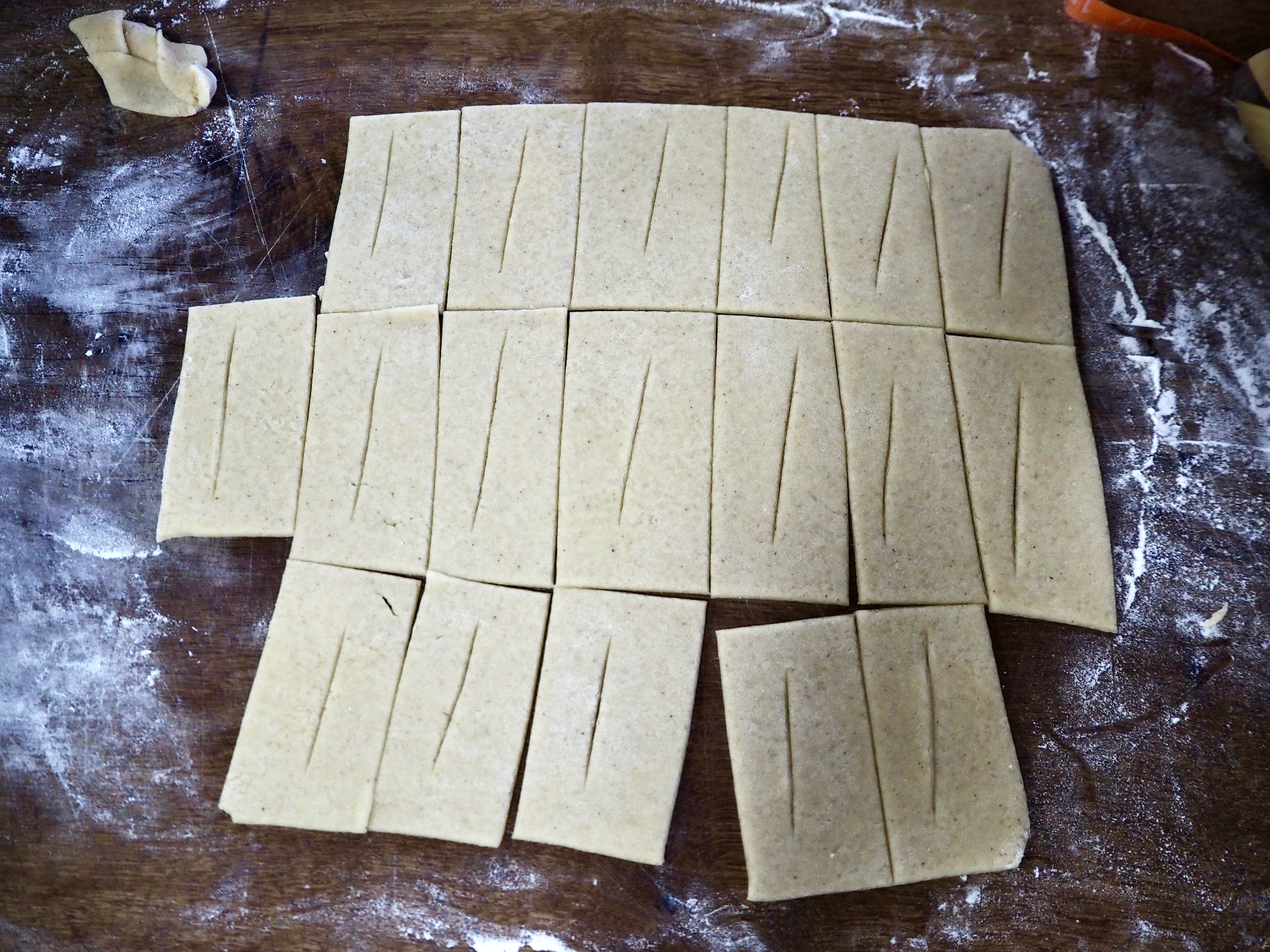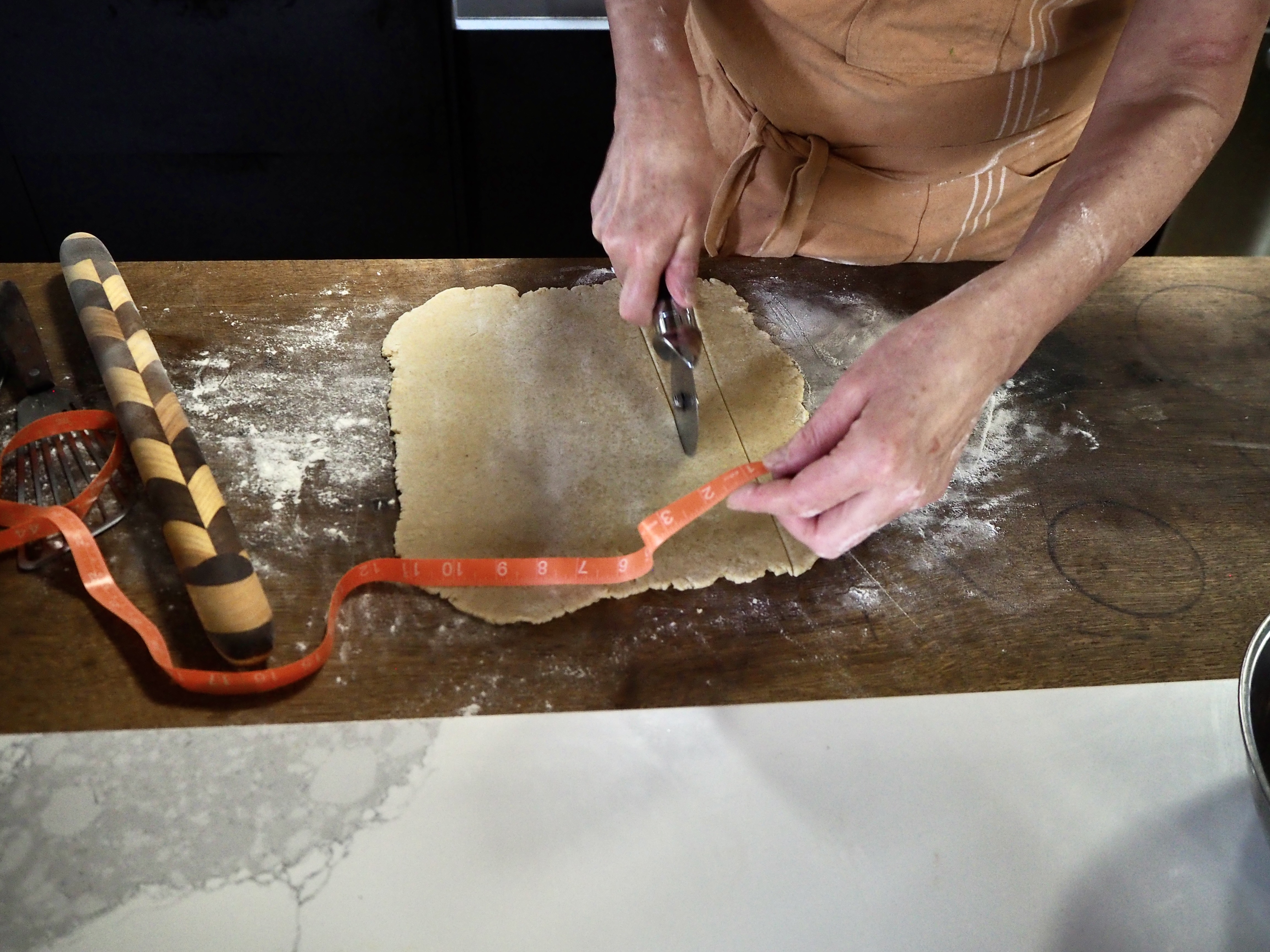 Then cut the dough crosswise so that each strip is roughly 4 inches long. (The dough will resemble a grid. See photos below.)