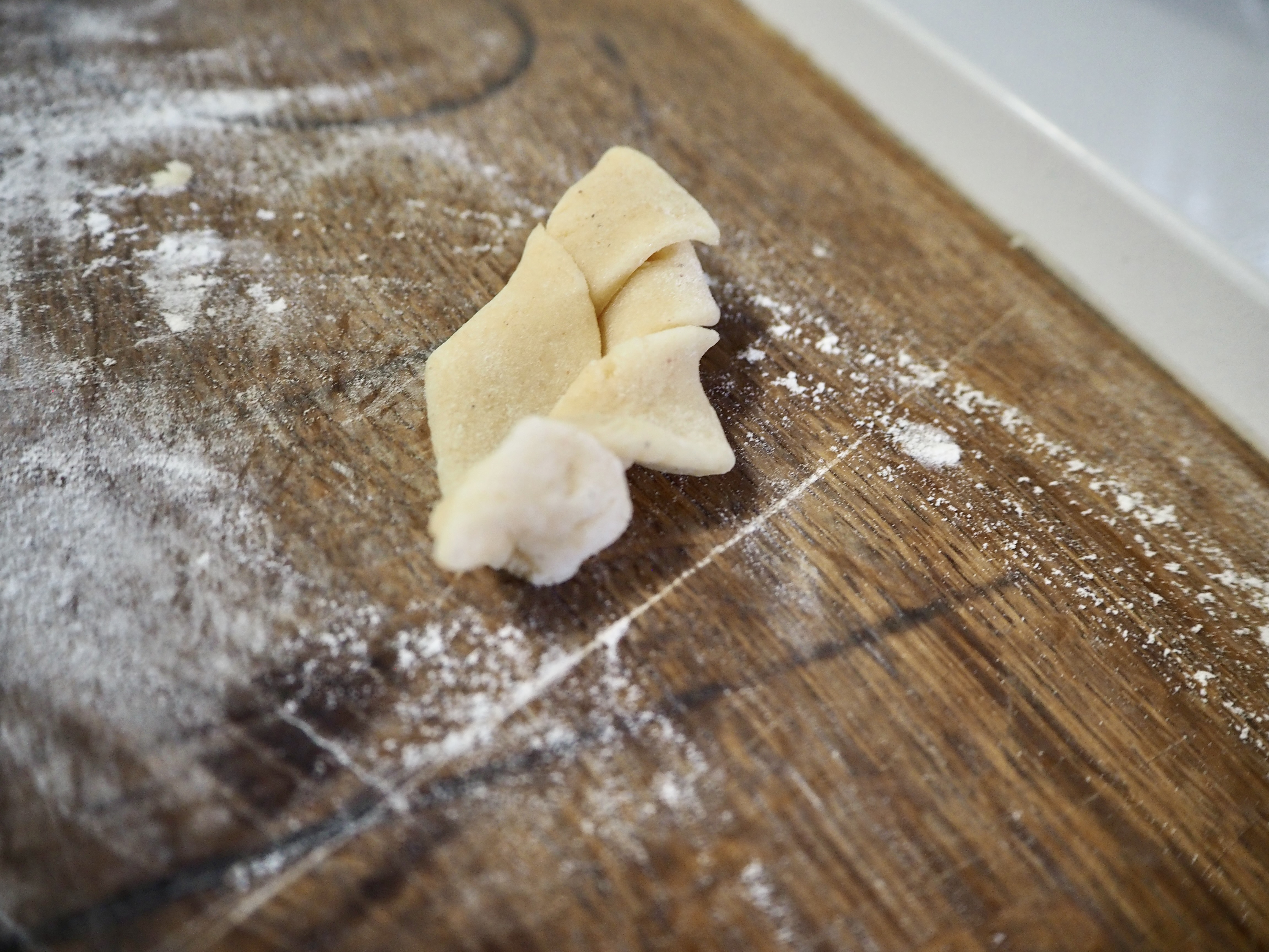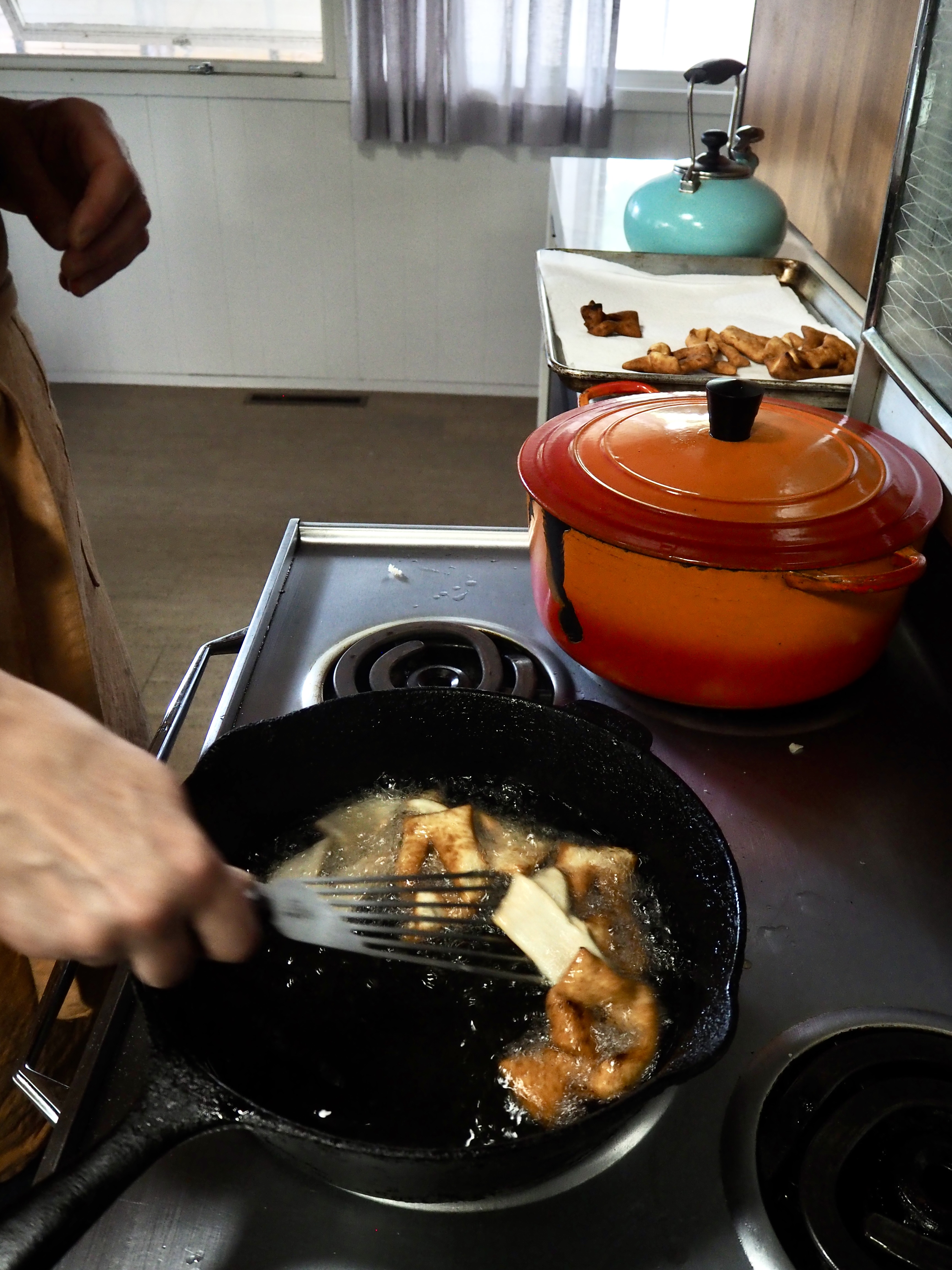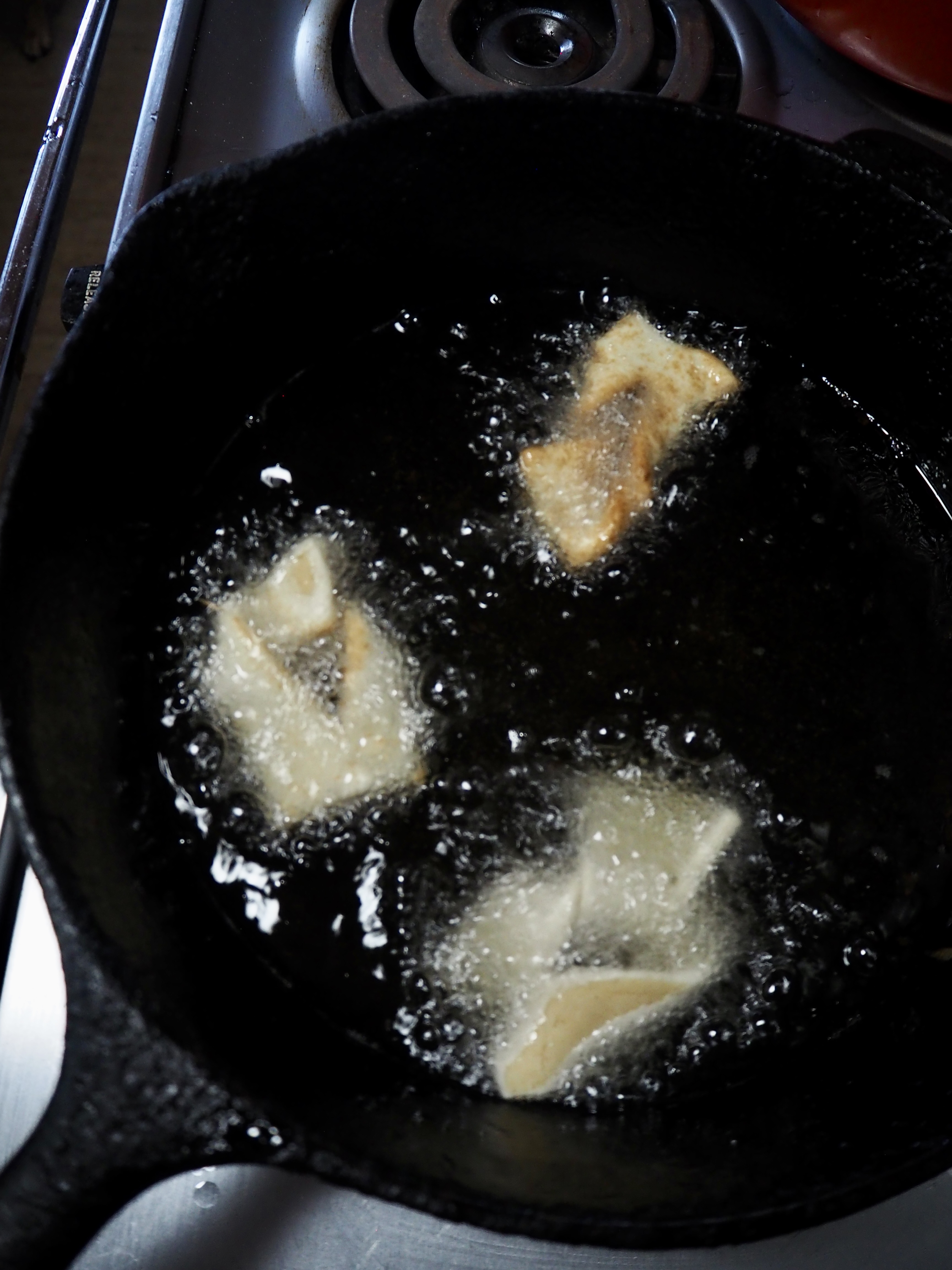 Repeat with the second half of the dough. You may want to turn off the heat under the oil while roll and cutting this batch so that it doesn’t get too hot.