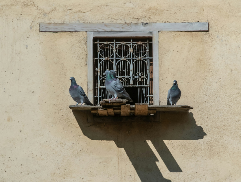 Painted birds flying from a rooftop.