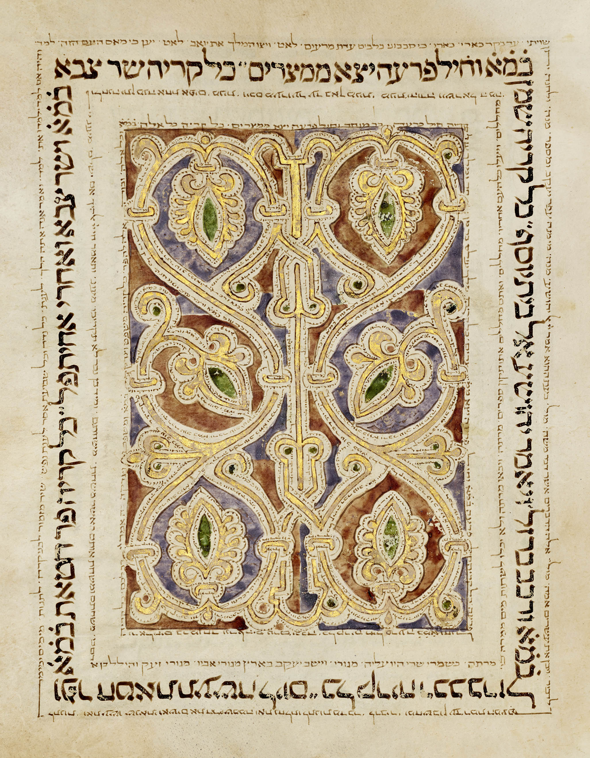 Hebrew Bible with Masoretic notes and Targum Onkelos, Burgos, Spain, 1260. A decorative carpet page separates the Pentateuch from the Prophets. It features multicolor illuminations, gold leaf, micrography, and biblical verses, folio 114r. Ms. Heb. 24° 790.